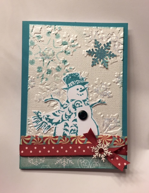 1.embossing folder 2. Stamped image 3. Peacock feather distress ink for stamping 4. Stencil 5. Ribbon 6. Washi tape 7. Snowflake sticker 8. Red gem 9. Button 10. Diecut snowflake 11. Diamond stickles glitter 12. 1 small piece of pattern paper at the bottom of the card