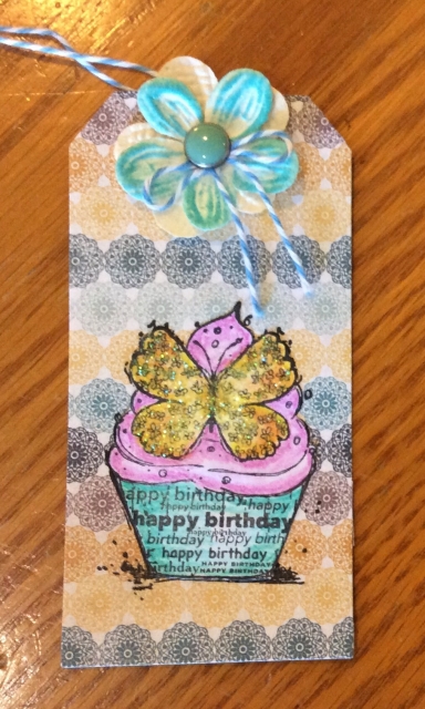 It was really handy to have that colored stamped image today as I needed a gift tag to be made up quickly. I just fussy cut the stamped image (Unity) that I had colored. I won this stamp from Unity on their facebook page a month ago and had not stamped it until the drive by. I just cut a tag with my Tim Holtz die from some patterned paper, and then made an embellishment from flowers and a brad. This looks lovely with the glittered gift bag I purchased today at Target.