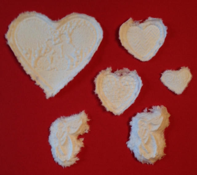 I cast 4 hearts and 2 angels from toilet paper. The details are a little hard to see in the photo, but the bigger heart has some trees and kids on bicycles on it. There is a heart with chevrons, one with mini hearts and the smallest has a faint swirly design.