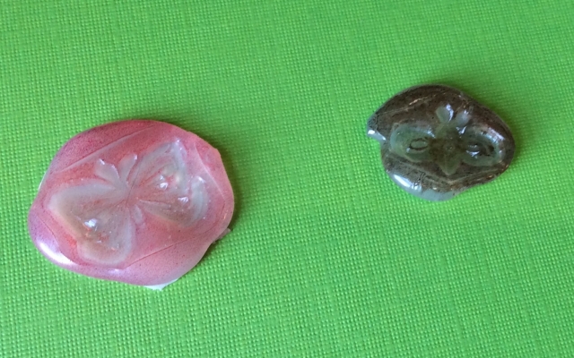 I decided to try the hot glue. My butterfly and bee stamps are from an old Stampin Up wood mount set that I bought at the thrift store. I did spray them with Pam before doing this.