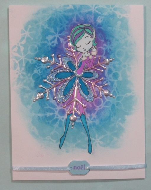 I stamped the fairy by Sweet November and then masked it before inking. I used Distress Ink in Wilted Violet, Stormy SKy and Tumbled Glass. Than I used a Memory Box Winter Snowflake Lace stencil. I colored the fairy with Copics and added liquid pearls for the snowflake part of her dress, stickles to her skirt, and flock to her cuffs. The sentiment is by Penny Black.
