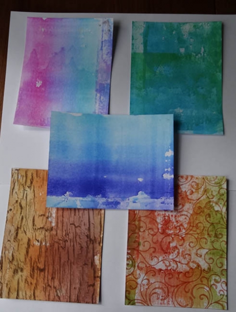 Row 3: Left-woodgrain stamping over Kaleidacolor Cappuccino Delight; Right: Hero Arts swirls over SU Pumpkin Patch ink pad--I am not in love with the swirls on this but not passing judgement until I try to use it.