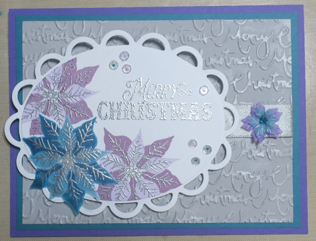 I actually used 5 of my Bingo colors: plum, lavender, teal, silver, and gray. The stamps are from my new set by Just Right. I used a mask over the teal poinsettia before stamping the purple ones. I used silver tinsel embossing powder for the veins and centers of the flowers and for the sentiment.