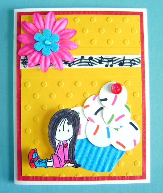 What a cheerful card! The crimping is perfect for the cupcake bottom and I like the music ribbon too!