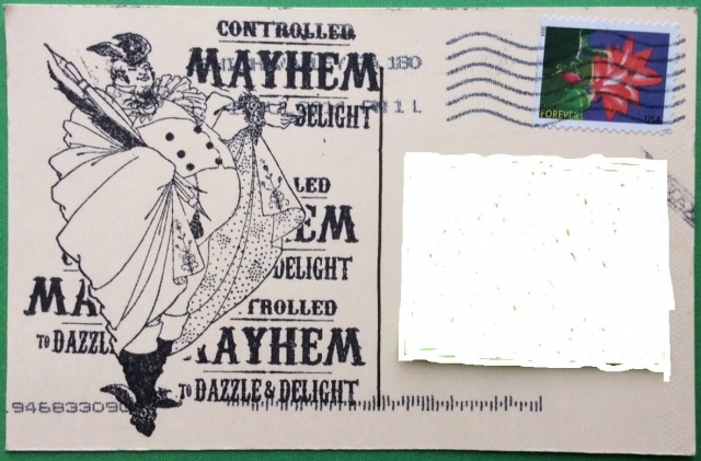 I made this for Heidi's Challenge using a piece of maila cs & stamps rak'd by Utah Ann. The white square hides Heidi's address. I kept this strictly black ink on the manila & rather like the way the PO's cancellation marks add to the look. I masked the gentleman & used the sentiment to surround him.