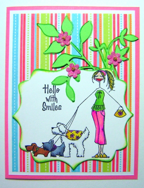 I don't think I have ever used this Stampingbella stamp! I knew I had seen a stamp in my stash with a girl walking a dog and I found it! Actually she is walking 3 dogs! I colored the image using Spectrum Noir alcohol markers. Thanks for the fun challenge.