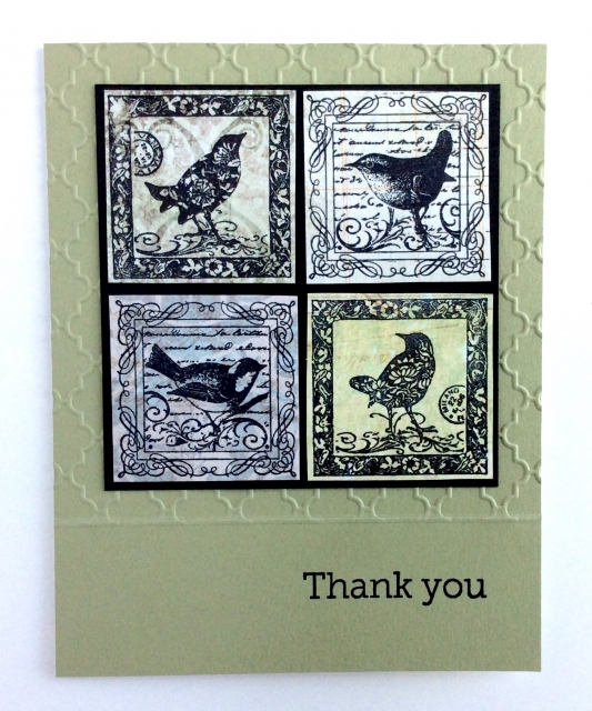 Here is my walk in the park. I like to go and see what birds I can find. I stamped this bird stamp on 4 different patterned papers and then cut them up and made into 4 different cards.