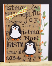 Adhered punched penguins (Stamin" Up) to patterned paper matted to orange card stock, then to white card base. Embellished with vine die cut (Memory Box) and bow.