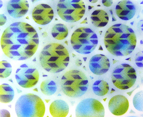I used one sheet of cs and started with my bubbles stencil. I used the crayola spray pump and used markers to spray green and blue on the bubble stencil. I then put a geometrical design stencil over the bubble stencil and used a dark blue to spray over that. The result is having the shapes inside all the circles. There was a lot of white space so I sponged light blue over the whole background to tone it down a bit.
