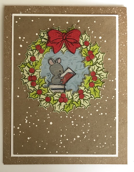 Ok, after taking another look at Conniecrafters entry ... I decided I needed more snow! I made 4 more cards on kraft bases that I spritzed with a toothbrush dipped in Liquitex Acrylic Titanium White ink. I decided to leave the sentiment off this one. (I had the same thought as Heidi, was the creature stirring if he's up reading a book?! Ha!) . Tell me what you think. I thought leaving the colored, pp, only behind the open wreath might make it look more like you were peering in to the mouse's hole.