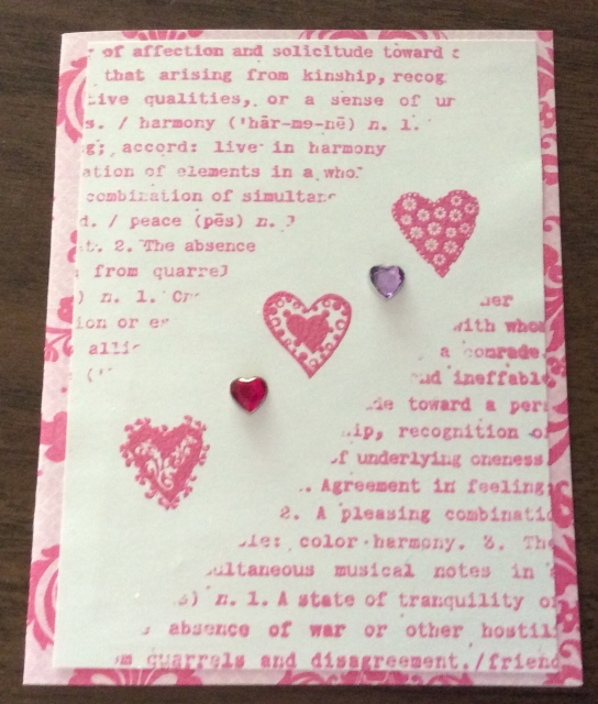Stamped large word stamp in corners. Stamped three hearts and embossed them added gems for an anniversary card. Used oxide inks.