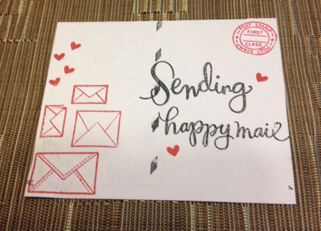 Here's the other side of my postcard. I stamped the same line stamp in memento tuxedo black ink down the middle of the card. Stamped envlopes in various sizes on to the left coloumn with SSS lipstick red ink and also stamped a few hearts. On the right side I stamped the sentiment with black memento ink. Added some more hearts and another first class image. All images except first class circle are from Simon Says Stamp