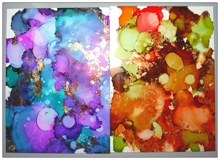 Here are my backgrounds I made for the Mirror challenge. earlier I had used flat foil on my alcohol inked background but this time I tried gilding flakes. I applied the flakes when the alcohol ink was tacky. They worked well. I waited a bit after putting them on, patted them down with my fingers and brushed them off with a brush. I think these gave more texture to the card.
