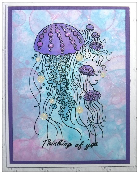 This is the first time I have blown bubbles using acrylic paint. This was fun! I made 4 backgrounds. I used one for this fun stamp from Stampendous. The saying is from Just For Fun. I colored using alcohol markers and glitter pens. I added white sparkle enamel dots for bubbles. They are hard to see in the picture.