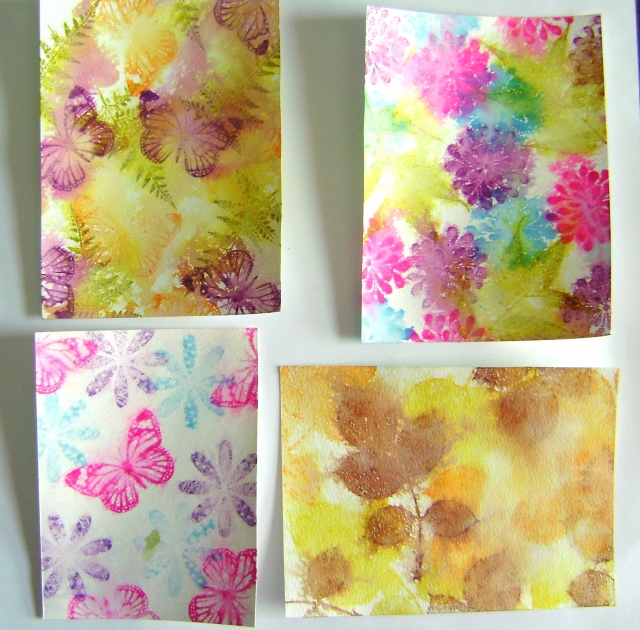 This was an easy and fun technique. Stamp solid images randomly on watercolor paper with dye based inks. I used Dustress inks. Spritz some water over the images and let them bleed. As you see some will bleed more than others depending on how much water you add. let dry and you have a nice background.