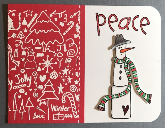 Stamps : Technique Junkies Snowman Whimsy and Christmas Whimsy (background stamp), Purple Onion Designs "Peace"