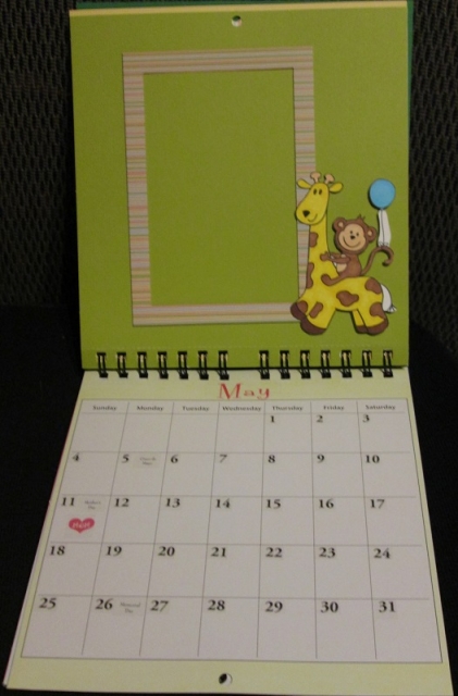 When making the calendars last year, I picked a theme for each calendar. Since my cousin had a baby in 2012, I decided on a baby/ little boy theme for her and my aunt's calendars. I also included either a photo frame or photo corners on each month so they could add photos of the little bugger. The image is a pink cat studios digi stamp and I used the paper from the kit to create the frame.