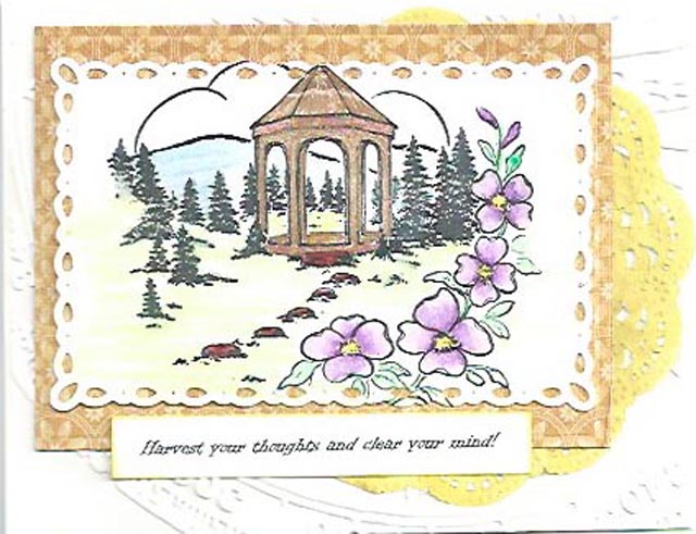 This is part of the KIAE September 2014 kit I received from SWLAdy. I used the image, the brownish background paper, and the doily from the received kit. I colored the image with watercolor pencils and gel pens. I printed out the sentiment and attached. I used a plain white card base that was embossed with an embossing folder.