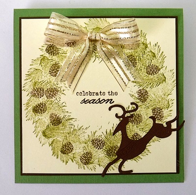 I made the wreath using my Stamp Gear a long time ago. The pine cones and needles are Rubber Stamp Tapestry stamps. The saying is by Sparkle N Sprinkle. The deer die is from Cuttlebug.