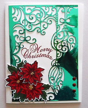I cut the die from Gemini from green mirror card stock. It is hard to get a good picture using the shiny card stock. The saying is from Sparkle N Sprinkle. The poinsettias came from the candle stamp I will show on 2 other cards. The stamp is also from Gemini. I colored with alcohol inks, fussy cut them and added them to the card.