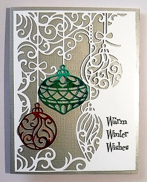 This die again was cut from white card stock and layered on silver metallic card stock. I cut out 2 of the ornaments from the other dies and added them onto the white die. The saying is from Sparkle N Sprinkle.