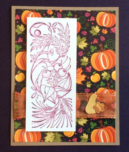 The image was stamped in memento brown ink on watercolor paper. A happy accident showed me that when you wet this ink, it will separate out into color which looks like plum. So I purposefully wet the lines with my waterbrush to get this effect.