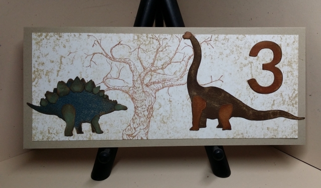 I made this card for my nephew’s third birthday. He loves dinosaurs and can even name them. He was so excited to get a dinosaur card and recognized Stegosaurus and Brontosaurus on the front and was thrilled to find Tyrannosaurus Rex on the inside. The last one was just the simple outline.