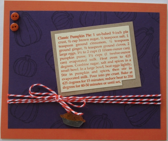 I made this with my kept kit. The kit items are the pumpkin pie recipe, the stamped background and the shrinky dink pie. The recipe stamp is by Impression Obsession and stamped with Hero Arts Just Right shadow ink. The pumpkins are by Fiskar and stamped with Versamark.