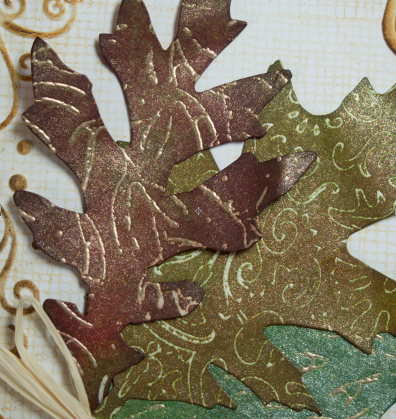 Here are the zoomed leaves. I used two different embossing folders to stamp with Versamark and then heat embossed.