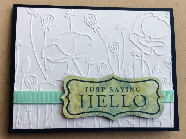 Embossed 4 inch by 5.25 inch white cardstock. Stamp sentiment on patterned paper and fussy cut. Apply ribbon to white panel. Apply entire panel to navy cardstock. Pop up sentiment with dimensional adhesive.