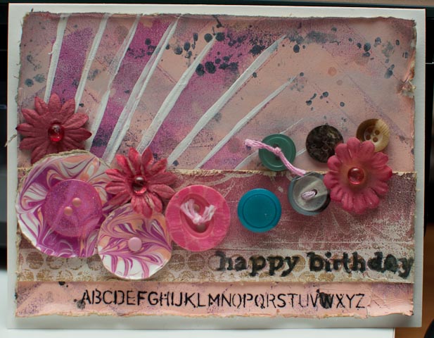 This card is for the Mixed Media Challenge for Inktoberfest 2014. The background is paint and gesso, the two pink and white circles are the part from the Challenge. The two stamps I used are both Tim Holtz.