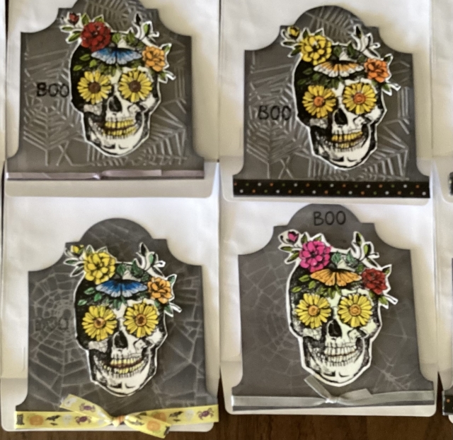 I stamped and embossed a new skull I got for my birthday. I colored with watercolor and cut out. The coloring is different on each of them.