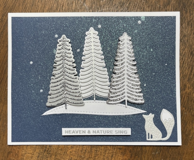 Even though I swore I wasn't going to die cut any more trees, all the paper and dies were still out so I now have a total of 5 of these silver bottle brush tree cards. I'd been thinking my first silver tree card looked a little plain. I also thought my trees were floating. I remembered I just bought some shimmer spray so I sprayed the navy card fronts. I used dies to make a little patch of snow. And added white crystal drops with a ball stylus. They certainly aren't plain anymore! They aren't quite as garish as they look in the photo. I took a lot of photos trying to get a good one until I finally gave up. Ugh!
