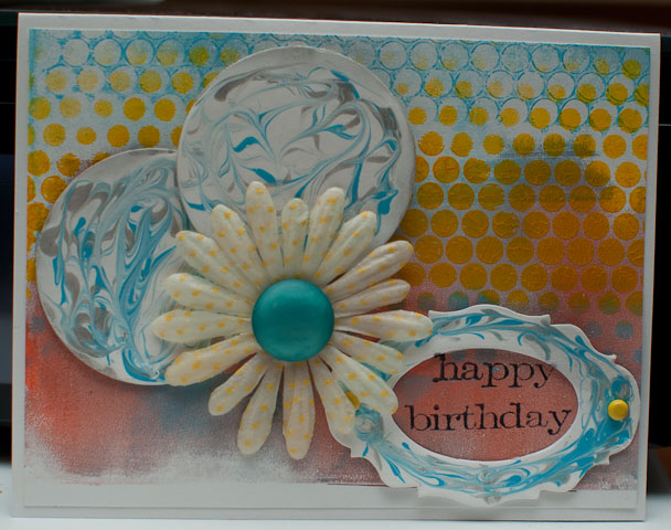 This card is also for the Mixed Media Challenge. The background is acrylic paint using a gelli plate, the flower is dipped in bees wax, and the circles and frame are made for the challenge using glue and acrylic paint.