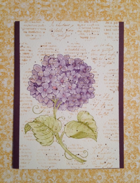 The background stamp is Hero Arts, stamped with Distress Vintage Photo on watercolor paper. The hydrangea is Rubber Stampede stamped with Distress Dusty Concord and Peeled Paint. I water colored the hydrangea with a damp brush getting most of the color from the outline already on the paper. I added Distress Spun Sugar to the flower centers and spattered with Distress Walnut Stain.