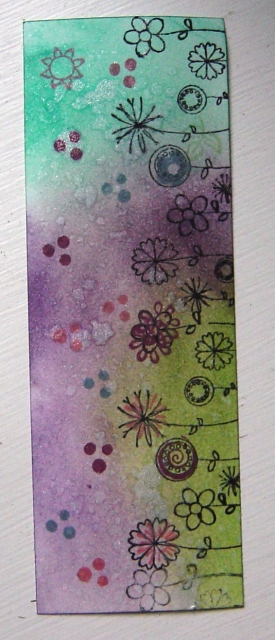 Here is my one layer bookmark. I inked the tag with distress inks. I stamped the flower stamp down the side twice so it would go all the way. Then I took my Hero Arts Tiny Backgrounds stamps and 3 colors of Versamark and stamped little things everywhere. Spritzed it with shimmer mist and voila!