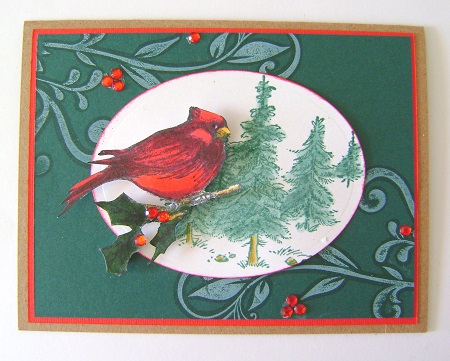 This card is beautiful! The swirls look so pretty with a shadow. Love how you mounted the cardinal over a pine tree background!
