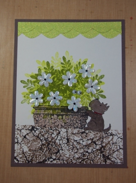 I picked 3 embellishments for this card: the white flowers, the moving eyeballs, and the green sparkly adhesive scallop tape (whew! lots of adjectives!). I stamped just the top of the column stamp with black dye ink and also the dog with the dye ink. I used a snowflake stamp for the flower bush foliage and stamped in two greens tones. I glued the flowers on then added black enamel accent for the center. I also glued on the eyeballs in the bush. I used a three-sided stamp block I have that stamps marble after you've stamped all three sides; I stamped one side in dark brown, the next side in a gray and the final side in a black to make the marble effect. I added the tape to the card top and then backed with the darker matting.