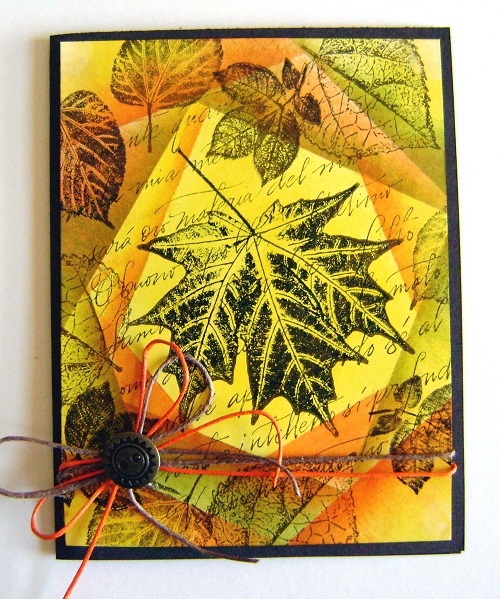 I used glossy card stock and post it notes to sponge color around them to make this grid. I then stamped a script background over it and randomly stamped leaves using Timber Brown Staz On ink.