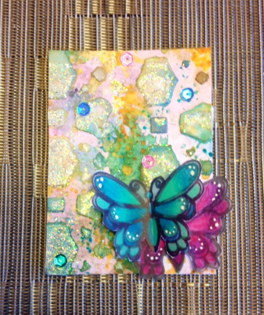 Daria was so gracious to swap with me! I didn't get a chance to upload my master board during INF but here's the ATC I made from it and sent to DariaI smooshed various shades of DI on to my craft sheet and spritzed with water and placed my paper on it. Let dry and adhered my stencil down to it and spread modeling paste over it. Once dry, I smooshed more DI on to my mat and spritzed heavily with water. Added a little Martha Stewart glittering glue to the paper and sprinkled some pale blue stampendous glitter to some areas. For the butterflies I stamped those on to vellum with black stazon and colored with prismacolor pencils. Added some white dots with a gel pen. Adhered to the ATC and added a few sequins. TFL :)