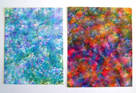 I used white glossy card stock on these. On the first one I used stream, meadow and wild plum alcohol inks with small pounces. I really liked the various colors I had on my scrap paper as I was doing my backgrounds, so I decided to make a background with 5 of the colors this time and I love it! This is the piece on the right.