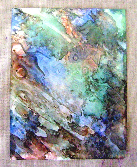 I just wanted to show how neat this background turned out using the monoprinting method. I put alcohol inks on plastic, laid the card stock on it, folded the plastic over and rubbed. The inks slid in one direction and turned out so cool! I am using this for my last challenge -- stamping and using a white gel pen.