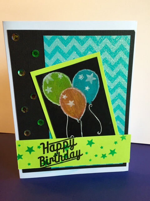 I stamped the balloon with memento luxe wedding white ink. i colored the balloons with prismacolor pencils and added some white stars to the balloons with colorbox pigment white ink.