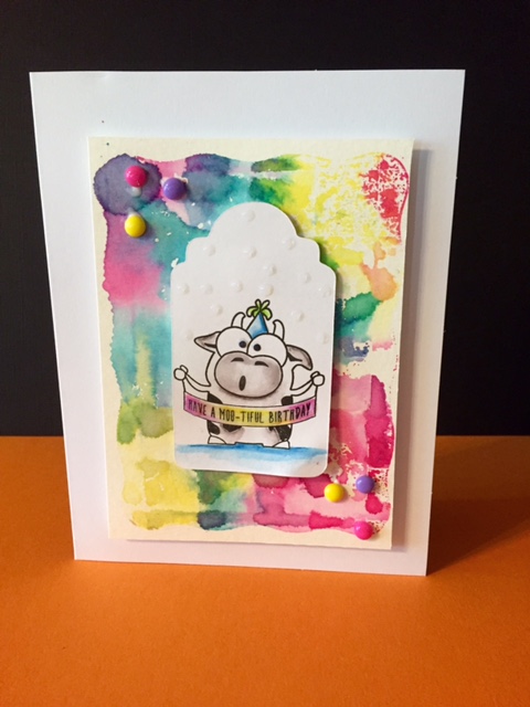 Image is from Simon Says Stamp- I colored it with inktense pencils and blended with a blender pen from Tombow. I drew a line with the pencil and blended it out for the cow to stand on. Added glossy accents to the banner, eyes, and some dots to the background of the tag. The background was made by applying picked raspberries, peacock feathers and squeezed lemonade on to an acrylic block and spritzing it with water. Added a few enamel dots to the piece.