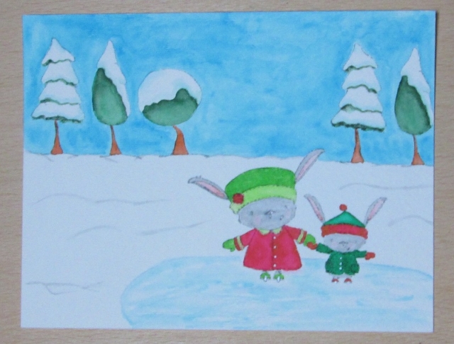 The stamps are by Purple Onion Design. I stamped them with Hero Arts shadow ink in soft granite. And I colored everything with my Zig Clean Color Real Brush Markers. I drew the outline of the lake with a watercolor pencil. I used a metallic pen for the ice skate blades and buttons and a black pen for going back over the faces.
