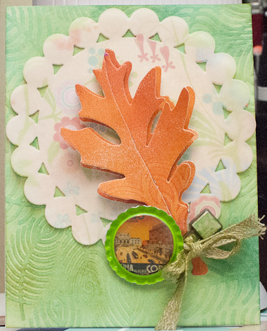 I used a piece of vellum to tone down the background of the oval on this card. The leave is a TIm Holtz stamp and cut without the stamping. The circle is cut with a die. The background is texture plates run through my Fiskars Fuse and then inked. The leave is actually from a piece of cardstock I colored with my gelli plate and a stencil. I used a bottle cap as an embelishment.