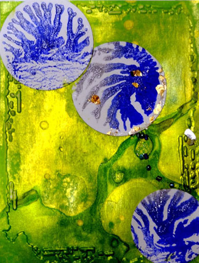 The focal images were created by smooching dots of paint into larger circles in a dendrite monoprint process. I particularly like the extremely fine dendrite pattern as seen at the base of the top left circle. To add movement and connection between the circles I added a path with blue beads.