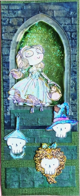 Inked & glitzed the interior of the arch. Used DI on the embossed surround. Colored & fussy-cut the girl & skulls. (details about the 'friends' on next photo)