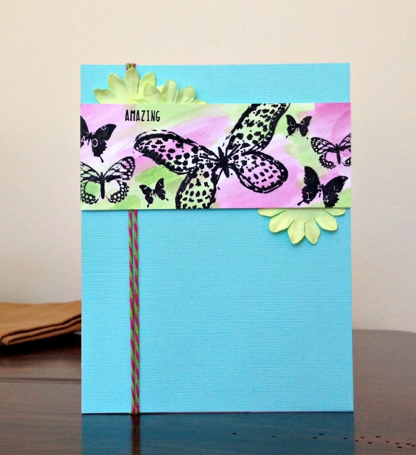 The items from my kept kit are: butterfly image, bakers twine, blue card stock, green paper flowers. The "AMAZING" sentiment I added was not from the kit. I used a water pen and distress inks to apply color to the butterfly image.