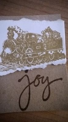 I created this tag from the kit I sent. It was a Christmas themed kit. I stamped the Christmas train image on white paper, hand tore it, and then added it to the kraft card stock. I had stamped the word Joy onto the tag before adding the torn image of the train.